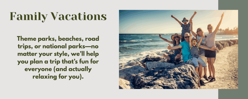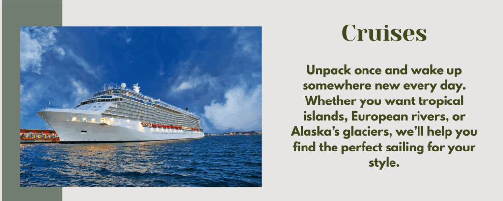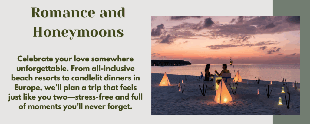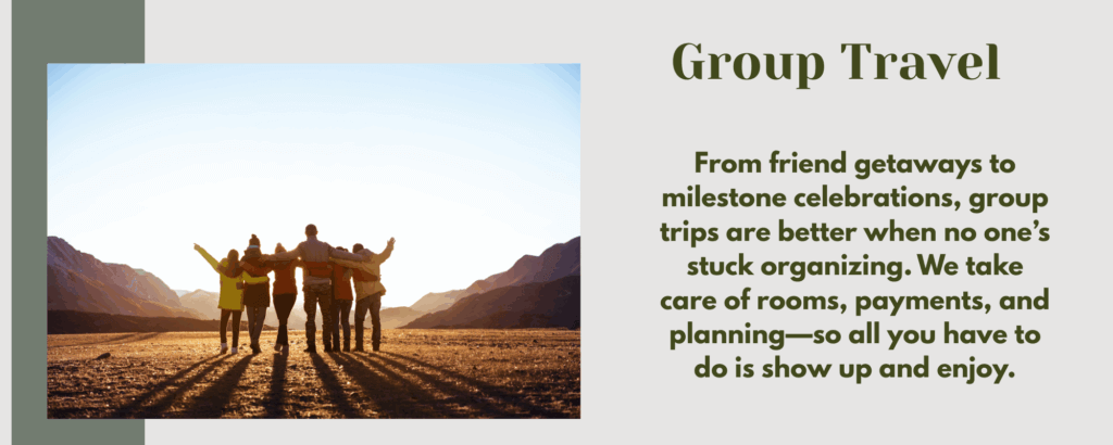 Travel planning should feel exciting, not stressful. We take care of every detail so your trip feels effortless from start to finish. From bucket-list adventures and family getaways to honeymoons, cruises, and everything in between, every itinerary is tailored to you. No cookie-cutter packages – just thoughtful, personal planning that turns your travel dreams into real experiences.